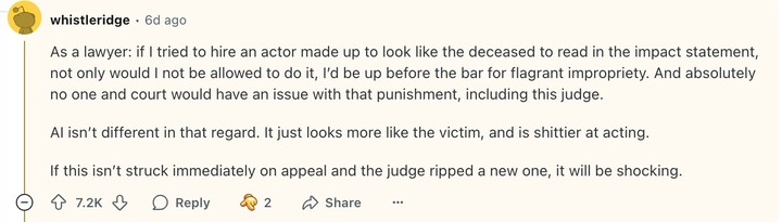 更令人惊讶的还在后面:法官采纳了这段由 AI 生成的受害者影响陈述,作为量刑阶段的证词。