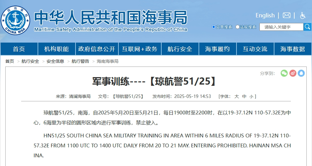 据中国海事局网站消息,清澜海事局发布航行警告,5月20至5月21日,每日19时至22时,南海部分海域进行军事训练,禁止驶入。