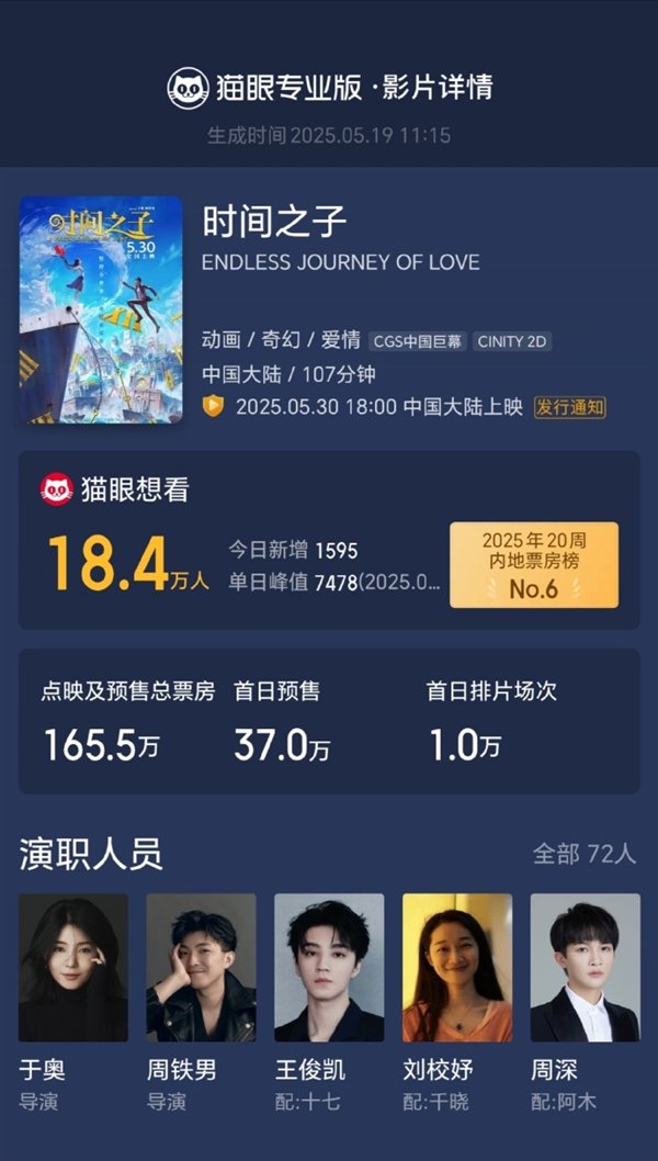 快科技5月20日消息,由于奥、周铁男编剧/执导的原创国产动画电影《时间之子》将于5月30日上映。
