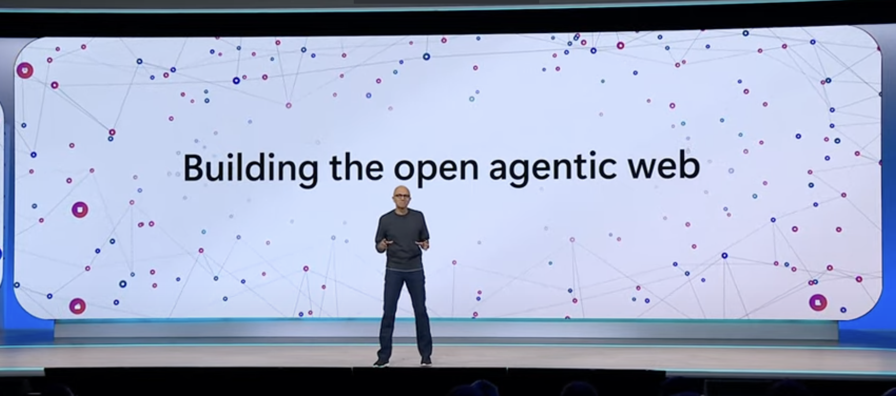 微软 CEO 纳德拉站在会场中心,还提出了一个变革性愿景:让更多的应用程序由智能体驱动,打造一个「Open Agentic Web(开放智能体网络)」。