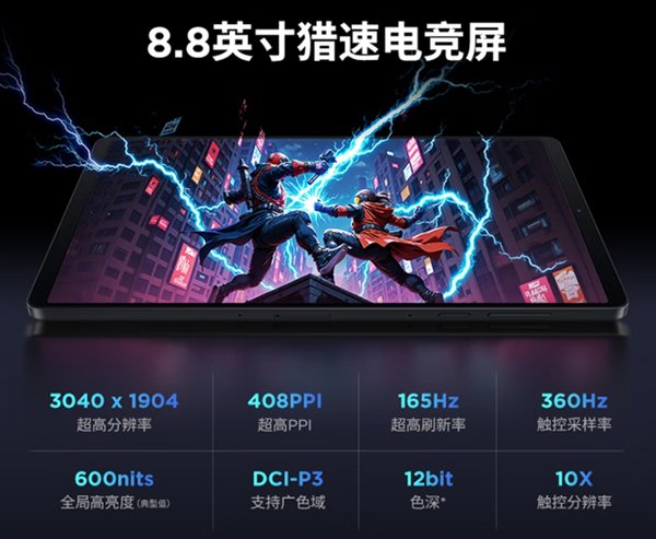 新款延续了前几代的小尺寸定位,采用8.8英寸LCD华星屏,3040*1904分辨率、支持165Hz刷新率、360Hz触控采样率,全局亮度可达600nits,支持DCI-P3广色域、12bit色深、10X超分辨率触控,16:10屏幕比例更适合游戏和视频。