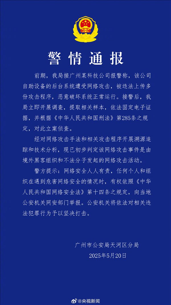 快科技5月20日消息,今日,广州市公安局天河区分局发布《警情通报》称,广州某科技公司自助设备的后台系统遭受网络攻击并被上传多份恶意代码。
