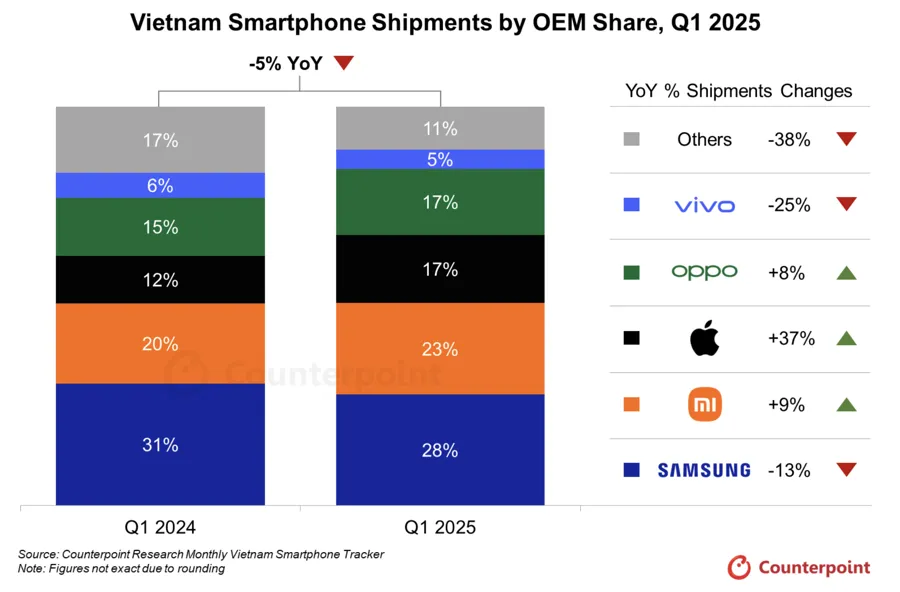 根据Counterpoint最新报告,今年一季度,越南市场智能手机市场整体出货量同比下降5%,但小米逆势增长9%,凭借Redmi Note 14的热销和渠道合作跃居市场份额第二。
