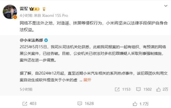 5月19日,小米法务部发布声明:2025年5月15日,小米公司从司法机关处获悉,此前公司报案的一起有组织、有预谋的网络黑公关案件已经告破。
