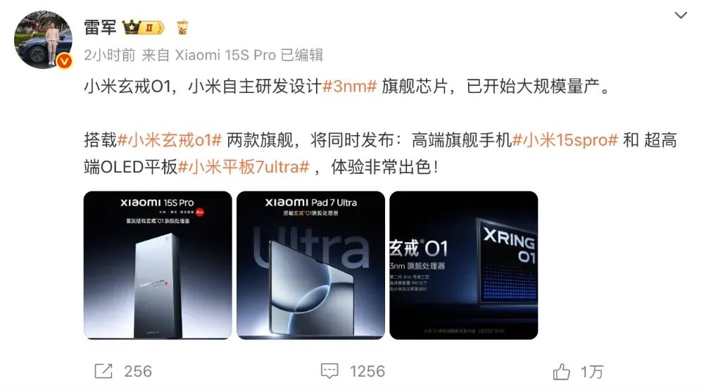 今天上午,雷军再发微博称玄戒O1将于本周周四(22日)晚上发布。并且小米玄戒O1已开始大规模量产,搭载小米玄戒O1两款旗舰产品也将同时发布:高端旗舰手机——小米15spro和超高端OLED平板——小米平板7ultra。