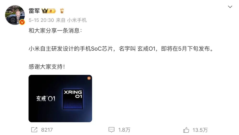 最早是15日晚雷军在微博透露小米自主研发设计的手机SoC芯片,名字叫玄戒O1,即将在5月下旬发布。19上午,雷军再次发文披露了更多信息。据悉,小米早在2014年就开始了芯片研发之旅,后来因为种种原因暂停了SoC大芯片的研发。2021年初,小米做出重启“大芯片”业务的战略决策,重新开始研发手机SoC。在玄戒立项之初,就提出了很高的目标:最新的工艺制程、旗舰级别的晶体管规模、第一梯队的性能与能效。