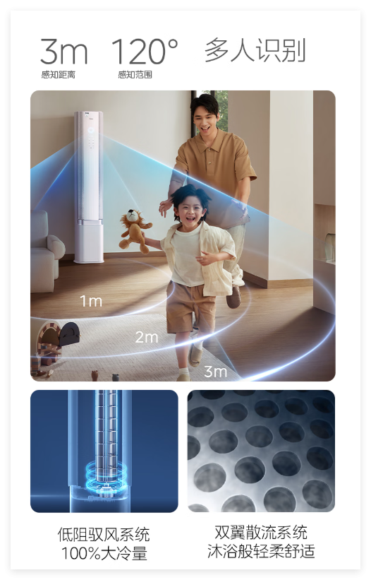 众所周知,传统空调在制冷时,风口会直接对人吹,往往屋子还没凉快身体就先着凉了,特别是老、幼、孕、婴及风敏感人群,很容易因此患上“空调病”,美的无风感技术的推出,就充分满足了消费者对既能保证制冷效果又能避免直吹身体的需求。区别于普通空调的“防直吹”,美的无风感技术直接改变了风的形态,通过出风口的细密微孔,将强风变柔、硬风变软,让风即使打在身上,也不急不燥,如羽毛般轻柔舒适。美的无风感空调·云朵系列柜机采用的AI无风感技术,就是利用毫米波雷达2.0系统,精准检测空调前方3米120°范围内的人体活动轨迹,当人出现在这个区域,就会主动开启左右分区无风感或全无风感模式,让冷风“绕道走”,不管老人、小孩,都能秒入舒适区,完全不用担心着凉。