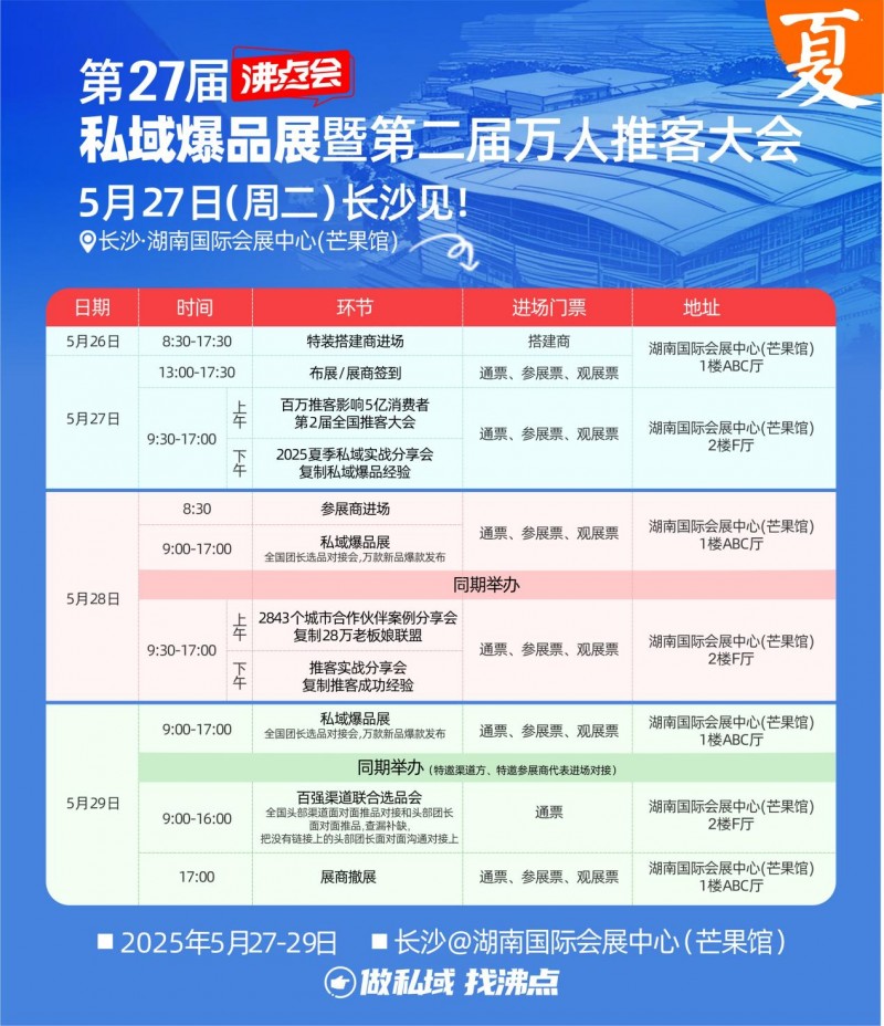 由沸点会主办的2025夏季私域选品会暨第二届全国万人推客大会,将于5月27日-29日在长沙湖南国际会展中心(芒果馆)盛大举办。这场行业盛会集趋势洞察、资源对接、实战方法论于一体,为推客、品牌方与私域从业者搭建深度链接平台。