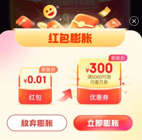 每日抽奖获得红包后,用户还有机会获得额外的 0.01 元红包或红包膨胀权益。用户可以选择直接领取 0.01 元红包,或者行使红包膨胀权益,将0.01 元红包置换成为更大面额优惠券。优惠券面额和力度随机,可购买商品范围会有变动,请以优惠券页面和下单页面说明为准。如用户关闭页面或未选择相应权益,视为自动放弃。➢ 每日助力任务:通过点击页面按钮邀请好友助力,完成每日助力任务。好友成功助力后