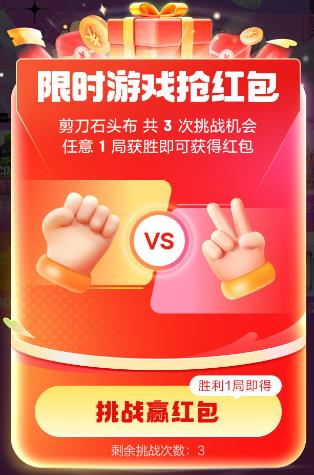 活动会在不同的时间节点,开启“猜拳抢红包”玩法。活动期间用户可参与猜拳玩法,每人最多 3 次机会,单次机会用户选择石头、剪刀、布任意一个,任意获胜 1 局(石头赢剪刀,剪刀赢布,布赢石头)即可获得领取额外奖励的机会,可随机获得京东红包、品类东券或店铺券等奖励。奖励限量,发完即止。