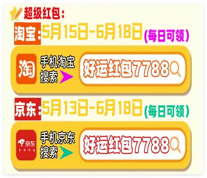 首先,划重点!今年天猫/淘宝和京东的618红包口令都是「好运红包7788」要记住!领的红包大小和你搜索的什么口令有关的!这个双平台通用口令包领到大的!记得每天去领!