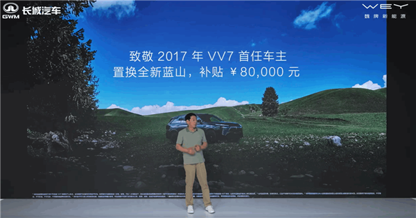 在此要感谢他们最早支持魏牌的用户,因此,凡是最早在2017年购买魏牌VV7的首任车主,在魏牌八周年之际,置换全新蓝山的,老魏将自掏腰包补贴8万元。