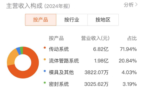 2024年,丰茂股份努力推动传动系统产品升级,模压多楔带的优势逐步体现,传动带在市场上的竞争优势更加明显,使得公司传动系统产品销售收入实现增长。2024年,该公司传动系统产品实现营收6.82亿元,同比增长25.20%,营收占比达到71.94%。