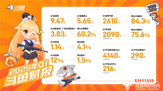 5月20日,斗鱼发布2025年第一季度财报。本季度斗鱼总收入9.47亿元,其中创新业务、广告及其他收入3.83亿元,同比增长60.2%;毛利润为1.14亿元,实现双增长,其中同比增长4.1%,环比增长62.6%;毛利率达到12%,同比增长1.5%,环比增长5.9%;运营亏损为2610万元,同比大幅减少84.3%;调整后净亏损为2090万元,同比缩窄75.6%。本季度斗鱼Q1平均移动端MAU为4140万,平均付费用户为290万,ARPPU为216元。新的一年,斗鱼持续推行的战略转型成果初显,业务结构调整继续深化,在新的市场环境下业绩开始展现向好态势。