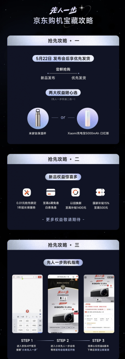 5月22日19:00,小米Civi 5 Pro和小米15S Pro将正式发布。为了让消费者能够享受更多优惠福利,京东联合小米打造先人一步加速换新计划,提供限量现货优先发货,最快发布会第二天到手新机。在京东下单小米Civi 5 Pro可享国家补贴15%,还可叠加以旧换新至高补贴1400元;先人一步下单还可享权益随心选,米家钛保温杯或Xiaomi充电宝5000mAh口红版二选一。小米Civi 5 Pro「夜色传神」限定礼盒也将在京东首发。即日起,消费者到京东APP搜索“小米先人一步”,即可进入活动页面预约小米Civi 5 Pro新机,方便发布会后第一时间下单。此外,首发搭载自研玄戒O1芯片、旗舰机型的小米15S Pro也已开启预约通道,快来京东抢先预约!
