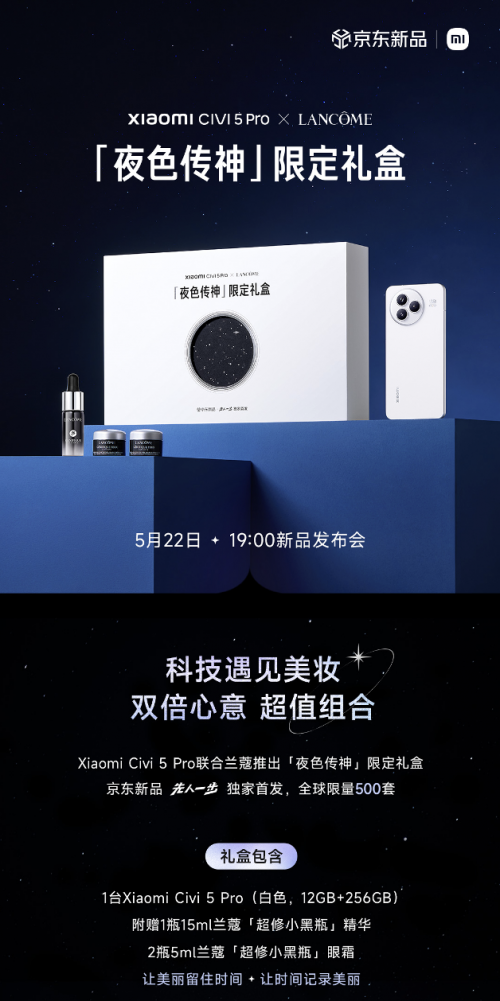 值得一提的是,小米Civi 5 Pro携手兰蔻推出「夜色传神」限定礼盒,在京东新品首发,限量500套,一场科技与美妆的盛宴即将拉开帷幕。礼盒包含一台白色12GB+256GB的小米Civi 5 Pro手机,附赠1瓶15ml兰蔻「超修小黑瓶」精华和2瓶5ml同系列眼霜,实现科技性能与护肤体验的完美结合。京东为小米Civi 5 Pro还准备了多重优惠福利,仅需0.01元,即可抢先锁定1年延长保服务,为后续使用增添保障。在京东下单小米Civi 5 Pro还可享至高6期免息、买赠1年碎屏保、买赠米家钛保温杯。