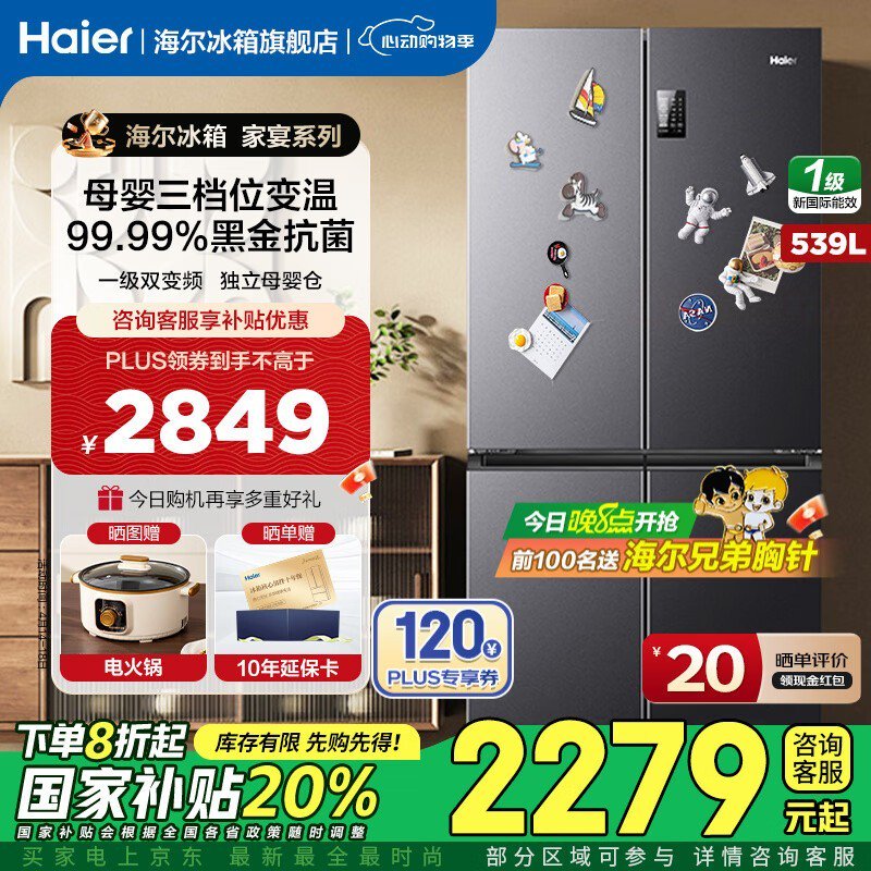 海尔539L风冷十字对开门冰箱低至2177元