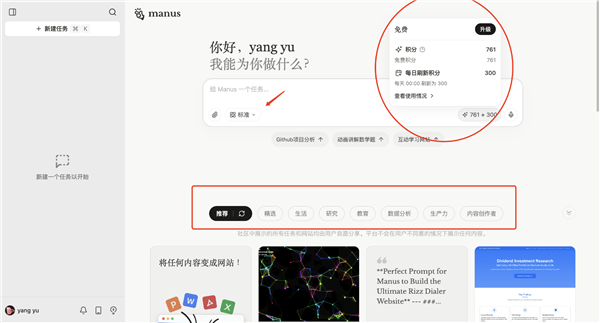 首先,Manus支持两种推理深度,标准版和高阶测试版。首次登录赠送1000积分,Manus提供了使用案例参考,分为生活、研究、教育、数据分析、生产力和内容创作者几个板块,社区中展示的所有任务和网站均由用户自愿分享。