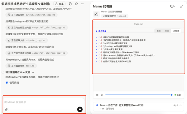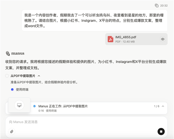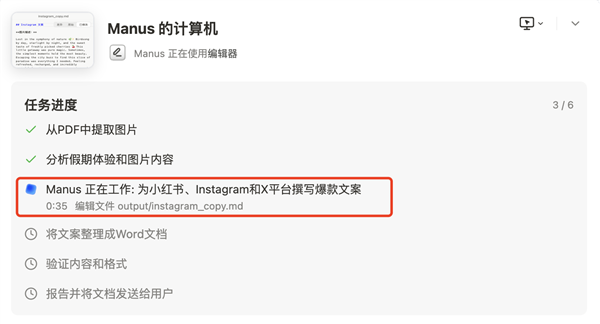 根据官方发布的简历筛选、股票分析、房地产调研演示的经验,预期中Manus将直接交付完整成果。因此,此次测试将上传四张图片附件,再写一段描述文字给Manus,要求它根据小红书、Instgram、X等平台的特点,分别生成爆款文案,整理成一个word给我。