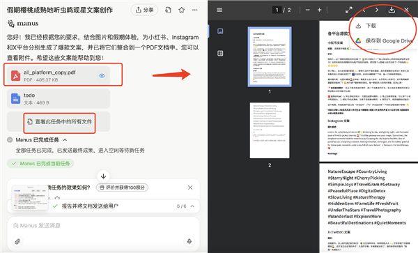 又过了4分半钟,Manus表示已经完成任务,提交了pdf格式的文件给我,我随时可以下载下来查看。