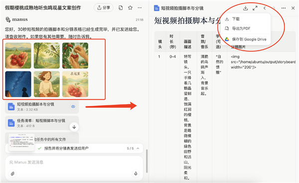 Manus帮我画成了分镜,也提交了表格形式的短视频拍摄脚本和分镜。