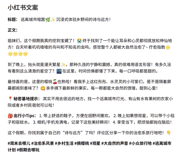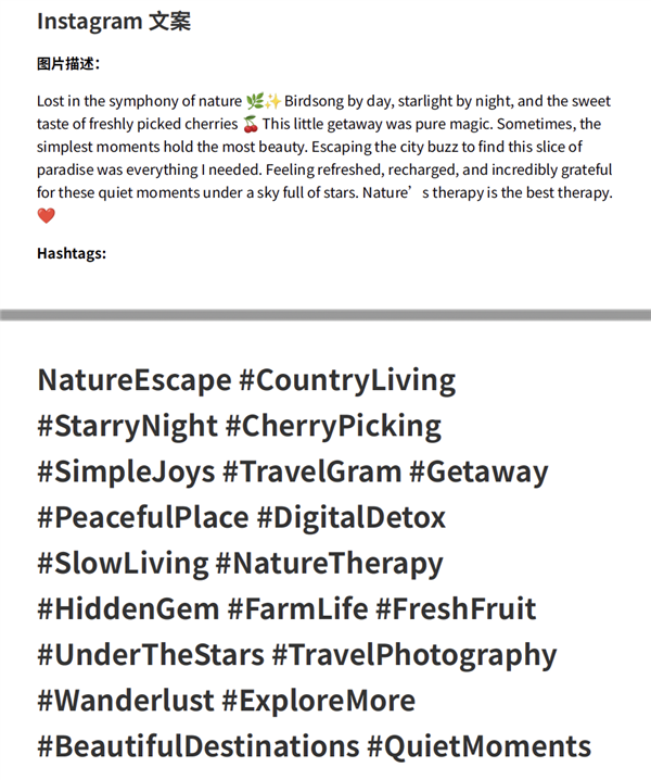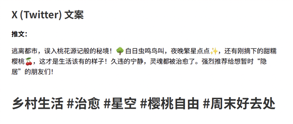 prompt:我是一个内容创作者,假期我去了一个可以听虫鸣鸟叫、夜里看到星星的地方,那里的樱桃熟了。请结合图片,根据小红书、Instgram、X平台的特点,分别生成爆款文案,整理成word文件。