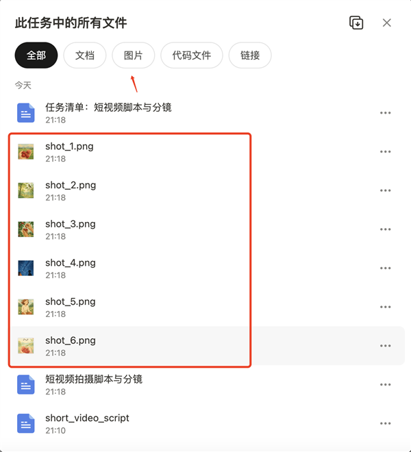 打开这次任务中的所有文件,相比上次的纯文本任务,图片分类下完整显示了此次生成的分镜图。