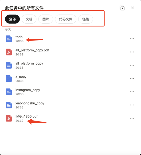 点开可以看到,它分为了文档、图片、代码文件、链接几个大类,并且按照时间顺序倒序排列,可以实现步骤上的溯源。