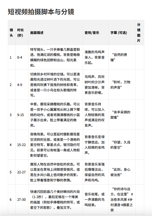 prompt2为:根据以上内容帮我生成一个30秒短视频拍摄脚本,并画出分镜,要求以表格的形式呈现。