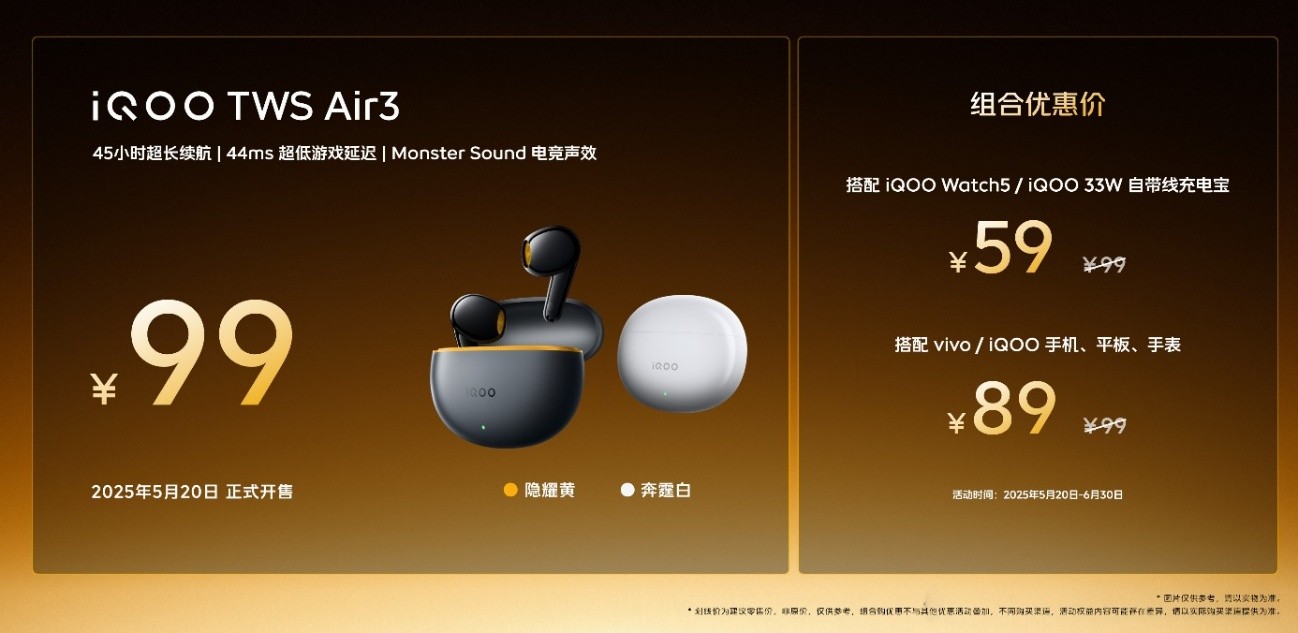 iQOO TWS Air3 具有“隐耀黄”和“奔霆白”两款配色,3.6g单耳机佩戴轻盈舒适,支持IP54更能安心使用;支持LC3音频编码,可实现全链路游戏44ms和耳机端 15ms的低延迟;耳机单次听歌可达10小时,单次游戏可玩6.5小时,配合耳机盒可长达45小时听歌续航,而充电10分钟,就可连手机畅玩游戏2小时,真正做到充得快、玩得久;拥有12mm高解析复合声音单元,具备空间音频、MonsterSound 电竞声效和DeepX3.0 立体声效,无论听歌还是玩游戏,都能带来更好聆听声效;支持蓝牙6.0多设备双连接和无线K歌耳返,并融入BlueOS生态,与生态内设备实现智联互通,是vivo/ iQOO 手机的极佳拍档。