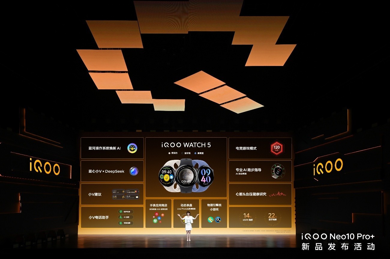 iQOO WATCH 5 搭载蓝河操作系统,实现系统级AI能力,将各种智慧功能都放进手表— 蓝心小 V梦幻联动满血版 DeepSeek,抬腕实现即问即答;小V电话助手不但支持手表一点接听,还支持智能摘要、同声传译与AI通话,在不便接听或外语来电时候帮你忙;全新升级的小V建议,可进行多类别的贴心提醒,表上即可查看;精通各项运动的AI教练,随时带你科学训练。