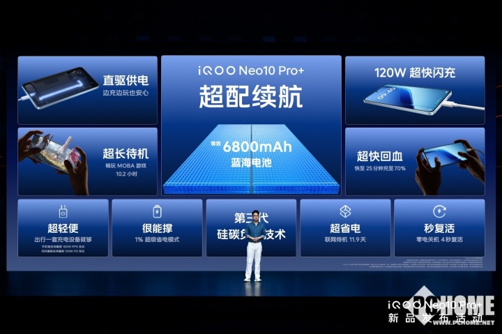 iQOO Neo10 Pro+配备6800mAh超薄蓝海电池,可以畅玩《国民级 MOBA 手游》10.2 小时、连续刷短视频 18.8 小时或视频通话 11.3 小时,还能联网待机 11.9 天。1%电量开启超级省电模式,可待机 3.1 小时,通话 31 分钟。