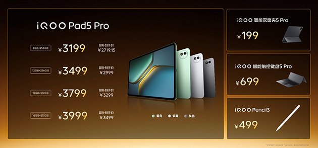 iQOO Pad5 系列共有“曼岛”、“灰晶”和“银翼”三种配色可选,iQOO Pad5 Pro 提供 8GB+256GB、12GB+256GB、12GB+512GB 和 16GB+512GB 四种存储组合可选,到手价 3199 元起,iQOO Pad5 提供 8GB+128GB、8GB+256GB、12GB+256GB 和 16GB+512GB 四种存储组合可选,到手价 2399 元起;iQOO WATCH 5 到手价 799 元起;iQOO 磁吸散热背夹 Pro、iQOO TWS Air3和 iQOO 33W 自带线充电宝到手价分别是 199 元起、99 元起和 129 元起。各款 IoT 设备搭配 iQOO Neo10 Pro+ 组合购买还能享受更多优惠。