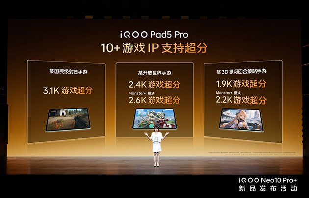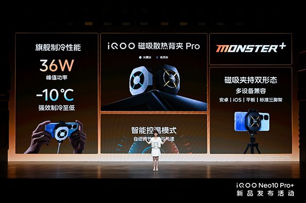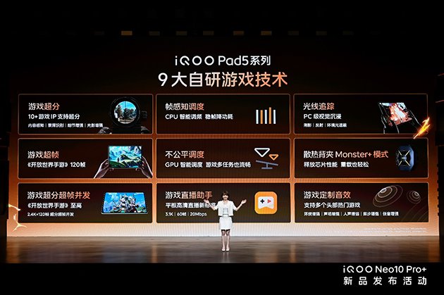 iMobile爱科技5月20日讯——“超配双芯战神”iQOO Neo10 Pro+ 正式发布,以同档领先的 2K Q10 珠峰屏与骁龙 8 至尊版双芯领衔 7 大“超配”,带来行业更好的超分超帧游戏生态,堪称“更为强大的游戏性能旗舰”。iQOO Pad5 系列、iQOO WATCH 5、iQOO 磁吸散热背夹 Pro、iQOO TWS Air3 和 iQOO 33W 自带线充电宝一同登场,与新机组成优秀的电竞生态,助用户的手游体验更上一层楼。