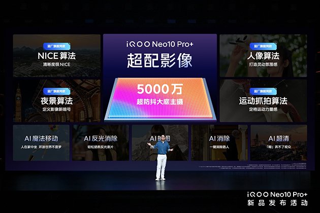 影像方面, 5000 万像素超防抖 1/1.55" 大底主摄,独家定制OIS和新一代 VCS 人眼仿生技术,蓝厂旗舰同款的夜景、人像和运动抓拍等 NICE 算法加持,还有 AI 修图大师为你拯救废片,玩出创意好片。Neo10 Pro+ 亦有当下热门的动态照片,同样支持 NICE 算法,还支持动态水印,并能轻松分享到微信朋友圈、小红书、微博和抖音,让照片更时髦。