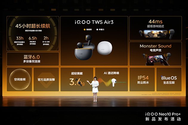 iQOO TWS Air3 具有“隐耀黄”和“奔霆白”两款配色,3.6g 单耳机佩戴轻盈舒适,支持 IP54更能安心使用;支持 LC3 音频编码,可实现全链路游戏 44ms 和耳机端 15ms 的低延迟;耳机单次听歌可达 10 小时,单次游戏可玩 6.5 小时,配合耳机盒可长达 45 小时听歌续航,而充电 10 分钟,就可连手机畅玩游戏2 小时,真正做到充得快、玩得久;拥有 12mm 高解析复合声音单元,具备空间音频、Monster Sound 电竞声效和 DeepX 3.0 立体声效,无论听歌还是玩游戏,都能带来更好聆听声效;支持蓝牙 6.0 多设备双连接和无线 K 歌耳返,并融入 BlueOS 生态,与生态内设备实现智联互通,是 vivo / iQOO 手机的极佳拍档。