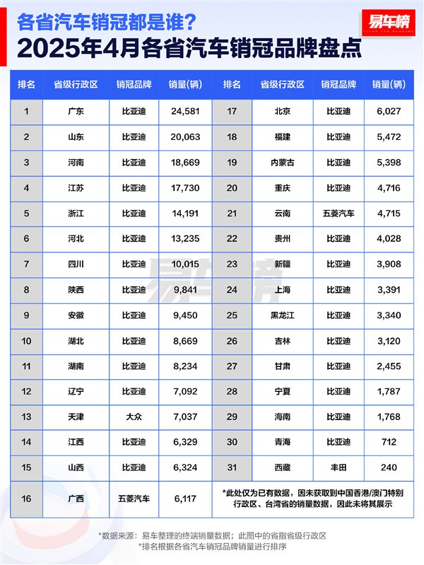 快科技5月21日消息,易车榜日前制作了2025年4月各省汽车销冠品牌及车型盘点。