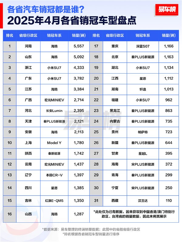 其中,秦PLUS新能源在6个省级行政区斩获销冠车型,成为2025年4月最受欢迎省份数量最多的车型;比亚迪海鸥拿下了5个省级销冠、宋Plus新能源为2个省级销冠。