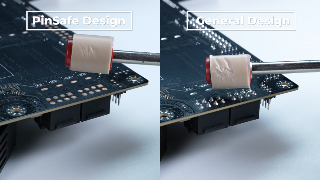 微星在设计主板时,一直致力于先进技术和提供友好的组装体验。正在申请专利的 PinSafe 设计作为一项全新功能,它让主板背部焊点不再凸起,提升了用户体验和安全性,避免了在组装过程中因主板背面的尖锐插针而造成的伤害。