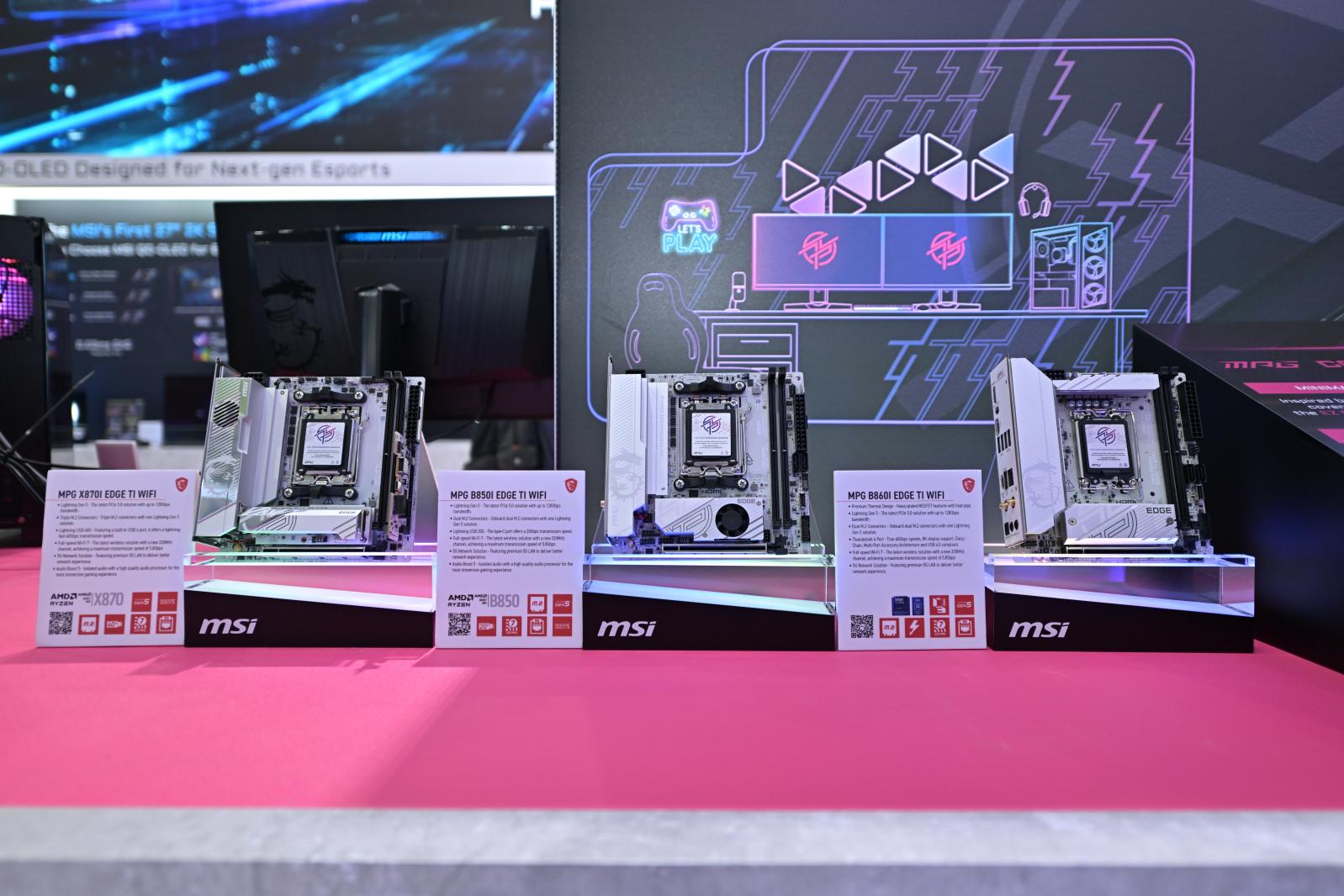 Mini-ITX主板一直备受玩家的期待。MPG家族的两款ITX规格主板MPG X870I EDGE TI WIFI刀锋钛和MPG B850I EDGE TI WIFI刀锋钛也亮相电脑展。这两款主板均采用银白配色方案,适配白色主题的Mini-ITX主机构建。B850I EDGE TI WIFI刀锋钛采用8相直连供电,Lightning Gen 5 PCIe和M.2解决方案,5G局域网和全速Wi-Fi 7,小心脏,大能量!MPG X870I EDGE TI WIFI刀锋钛支持USB 40gbps连接,5合1扩展卡和EZ M.2 冰霜散热铠甲使其具有更好的可扩展性和DIY体验。
