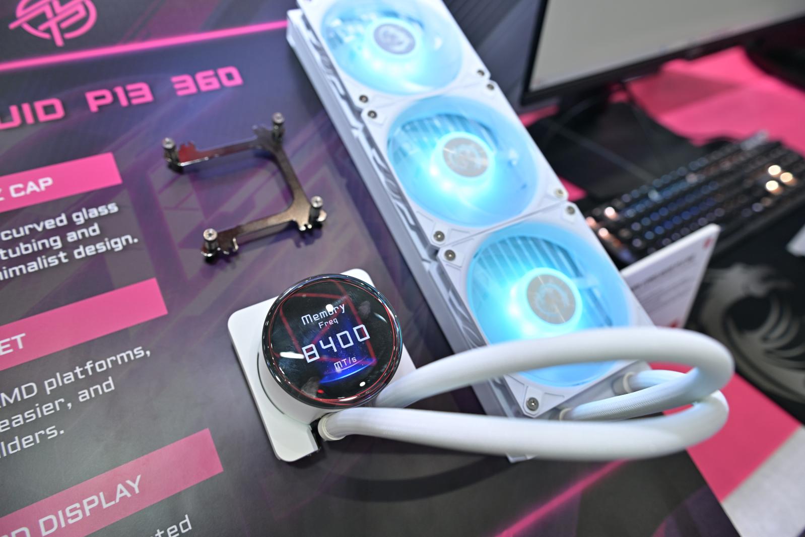 MPG CORELIQUID P13 系列则以水流线条为灵感的曲面玻璃风格纯粹美学。2.1 英寸液晶显示屏隐藏其下,支持实时监控、视频播放和个性化内容展示。流线型设计将所有线缆隐藏在管路内,呈现出优雅、流畅的外形。专属 UNI 支架实现了对 AMD 和 Intel 平台的无缝兼容,让安装更加简便。