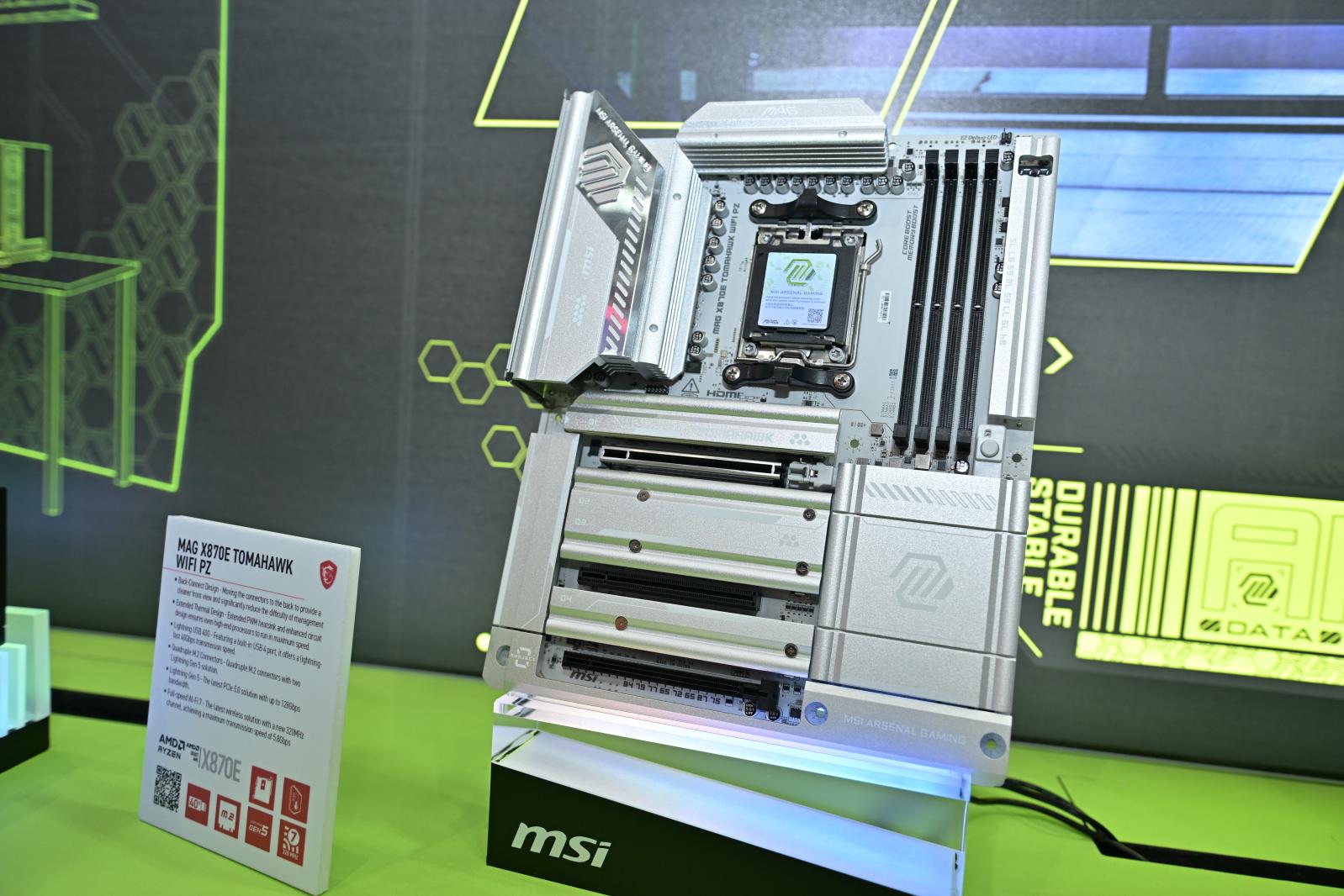 MAG X870E TOMAHAWK WIFI PZ 战斧导弹主板是 MAG 系列中的首款背插式主板,与 MAG PANO 系列机箱适配。其采用银白色主题和全覆盖设计,更具辨识度。在 MAG X870E 系列现有设计基础上,它提供了最新的连接技术,如雷电 5 解决方案、USB 40 Gbps、全速 Wi-Fi 7 和 5G 网卡。EZ DIY 功能和背插试设计简化了线缆管理,提升了 DIY 体验。