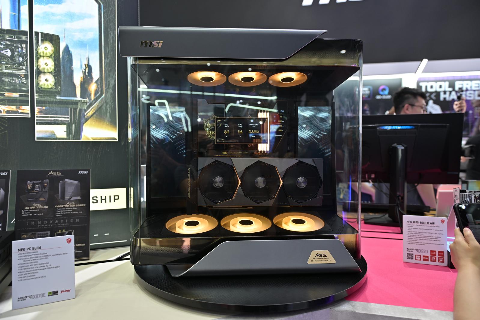 有两款新机箱产品也将后续和大家见面,让我们先来看看2025年的旗舰产品 MEG MAESTRO 900 系列。它被设计成一个展示箱的概念,让玩家能够通过它全方位的展示主机中的DIY配件装备。钻石切割设计边缘、三面钢化玻璃和灯光装饰的结合,优雅而奢华。MEG MAESTRO 900 系列拥有独家的四向主板托盘,可同时作为测试台使用,还有可扩展的 I/O 面板,以及对定制液冷系统的出色兼容性。它不仅外观出众,性能也十分强悍。