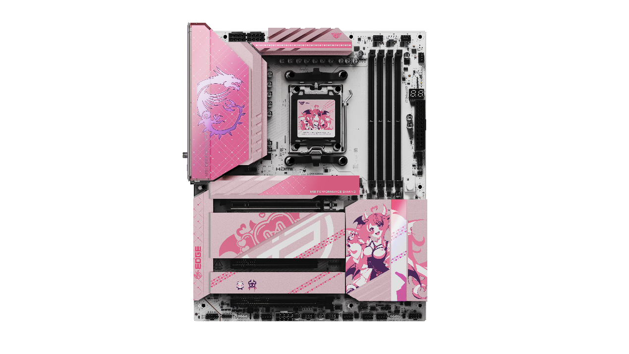 主板:MPG X870E EDGE TI WIFI 刀锋钛搭载了定制图爱元素,融入了IRONMOUSE的心形图标和色彩点缀,将原本技术性很强的组件变成了整套配置中的大胆亮点。