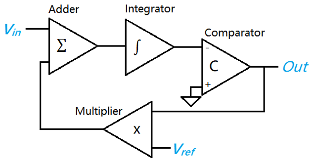 增量型 ADC 的拓扑原理图如下,先看积分器,如果输出小于 0,比较器输出 1,否则输出 -1,比较器输出 1 时,乘法器输出 Vref,否则输出 -Vref,所以当积分器输出大于 0 时,将有 Vin-Vref 输入到积分器中进行下一次比较,否则输入 Vin+Vref,记录每一次比较器的输出,统计输出 -1 的次数 X 和总比较次数 m,通过下方公式来计算输入电平,总的比较次数越高,分辨率越高。