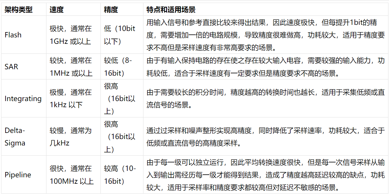 ADC 架构有:并行比较型(Flash),逐次逼近型(Successive Approximation Register),积分型(Integrating),增量型(Delta-Sigma),流水线型(Pipeline)等。