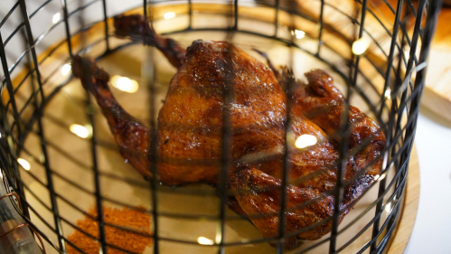 地狱炭烧鸡:这道菜外酥里嫩,香气四溢,铁笼造型的创意摆盘,独特的设计让人眼前一亮。鸡皮被烤得金黄酥脆,泛着诱人的光泽,鸡肉嫩滑多汁,裹着秘制调料的香味,每一口都让人陶醉其中。无论是作为下酒菜还是主食配菜,都十分合适。
