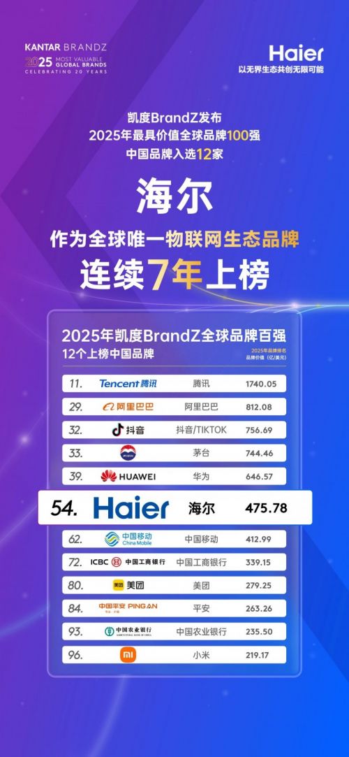 5月15日,凯度BrandZ发布《2025年最具价值全球品牌100强》榜单,中国品牌表现亮眼,总价值增幅达26%。其中,海尔第七次以全球唯一物联网生态品牌登榜,品牌价值同比增长超47%,排名从2019年的第89名跃升至第54名,总价值达476亿美元,成为榜单中增长最迅猛的中国品牌之一。
