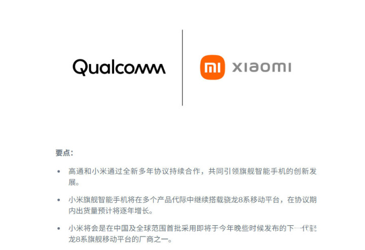 高通方面称,高通与小米将聚焦于在全球范围内通过旗舰智能手机引领技术创新。在协议期内,小米的旗舰智能手机产品将持续搭载业界领先的骁龙8系移动平台,覆盖多个产品代际,并将在中国及全球市场销售,出货量预计逐年增长。今年晚些时候,小米也将成为首批采用下一代骁龙8系旗舰移动平台的厂商之一。