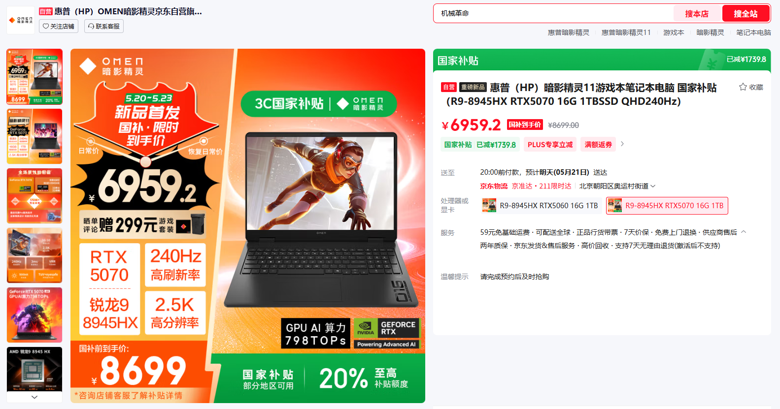 近日,新一代暗影精灵11锐龙版在京东等电商平台开启首发抢购,暗影精灵11 锐龙版最大的亮点是搭载锐龙9 8945HX处理器,并搭配最新的50系显卡,新品首发期间还可参与国补补贴8 折。R98945HX + RTX 5060 版本首发价7699 元,国补后到手价仅6159.2 元;R98945HX + RTX 5070 版本首发价8699 元,国补后到手价6959.2 元。